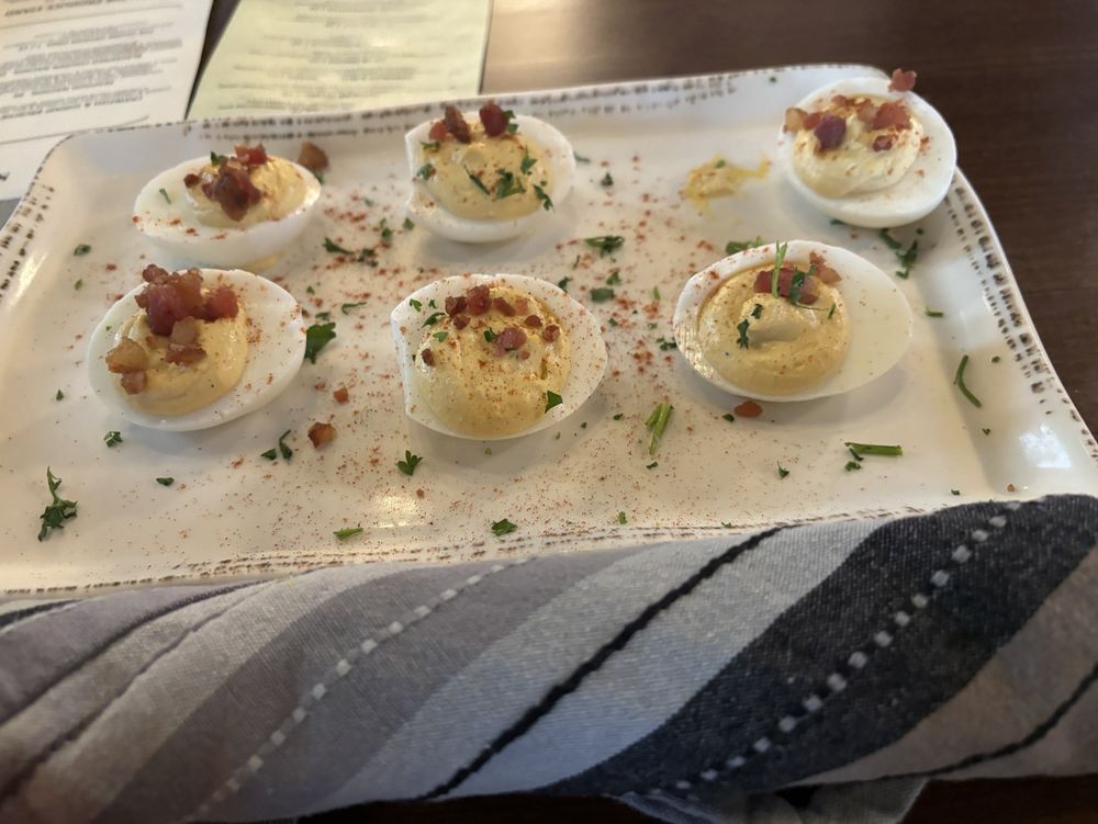 Our delicious deviled eggs topped with crumbled bacon, paprika, parsley. Available in a dozen or 12 dozen!